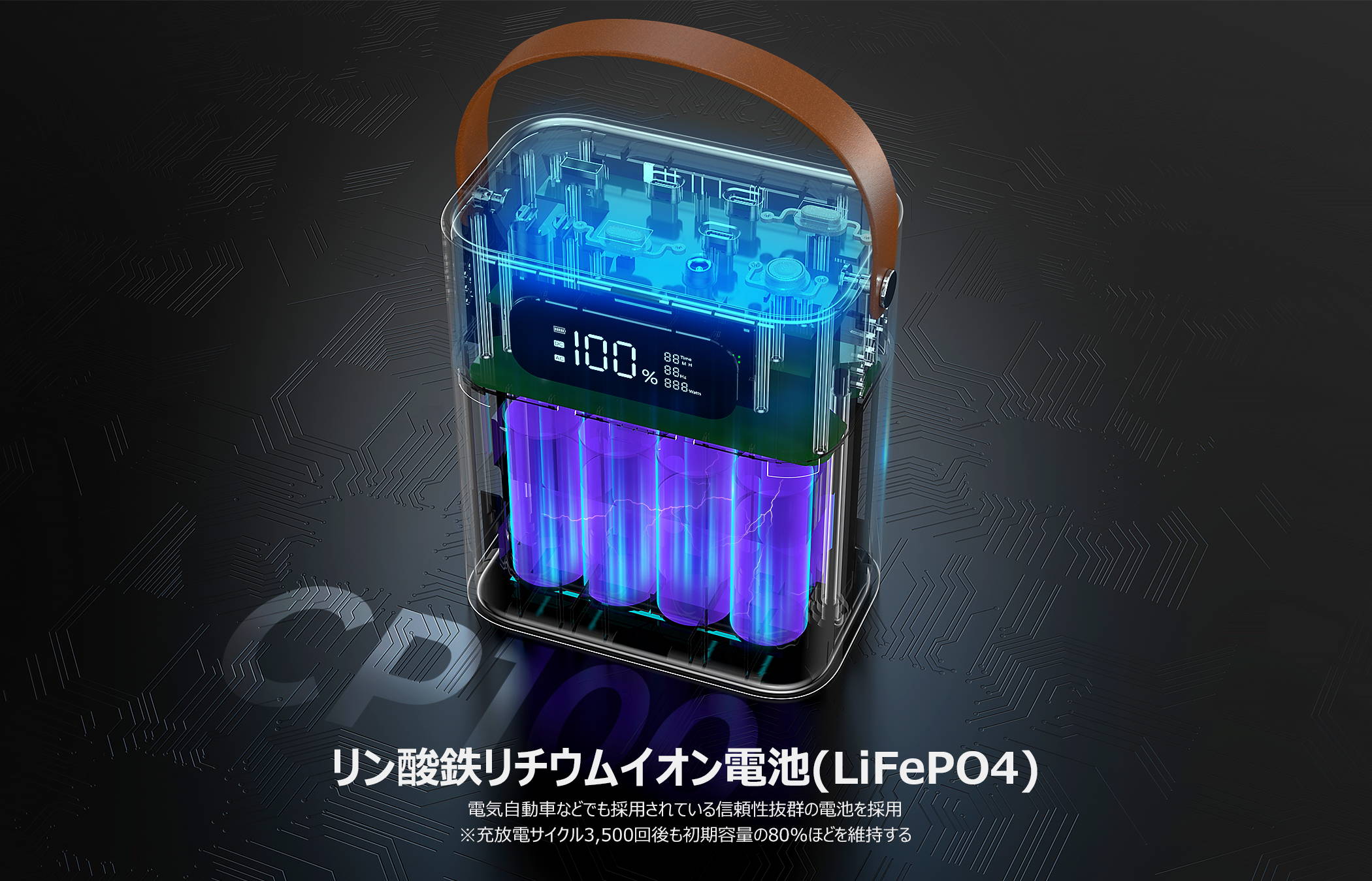 本製品では、電気自動車などにも使用されている、リン酸鉄リチウムイオン電池(LiFePO4)を採用。