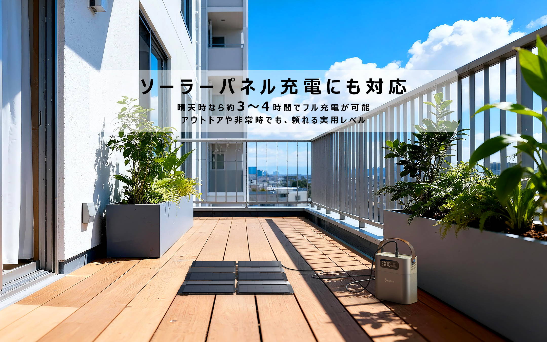 ソーラー充電対応で、もしもに備える、もしもを越える。日常と非日常を繋ぐ、新しいポータブル電源のカタチです。