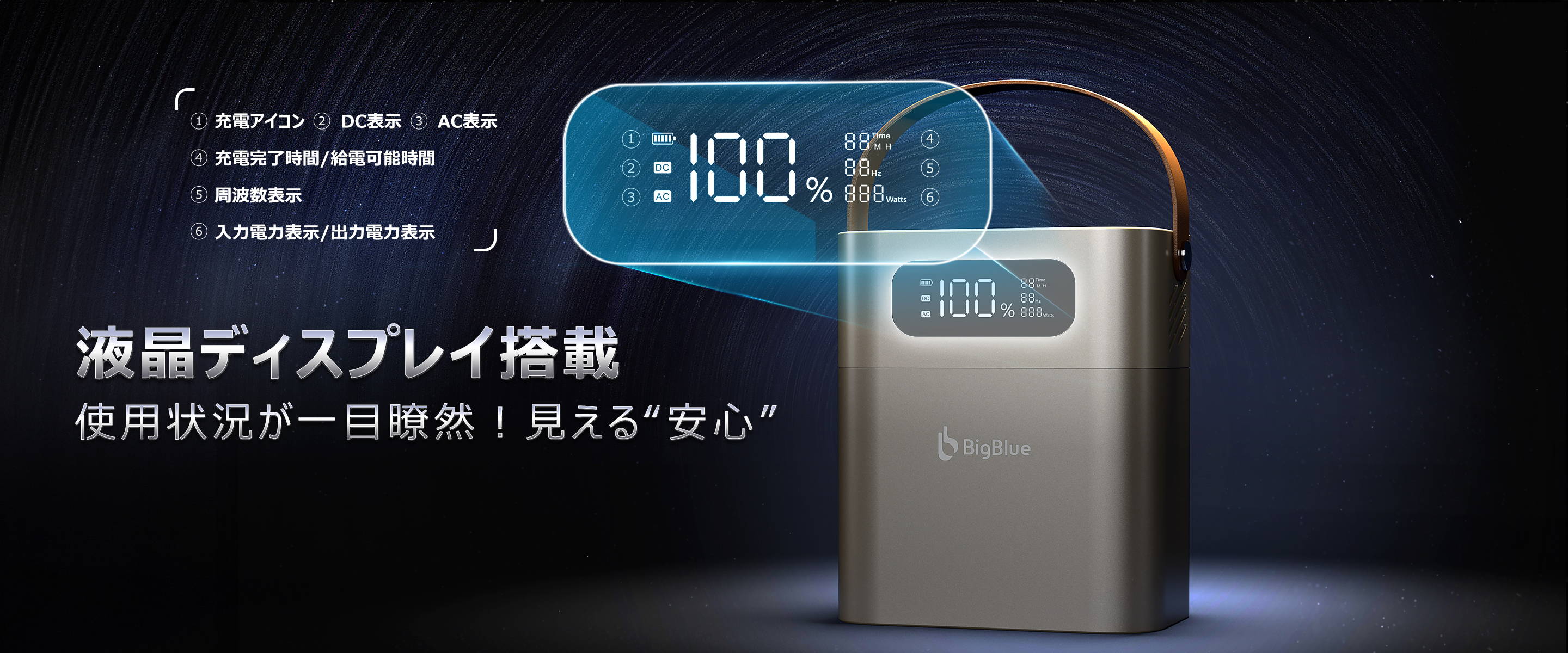 バッテリー残量や入力/出力ワット数、周波数、充電完了までの推定時間など、重要な情報を数字ではっきりと確認できます。
