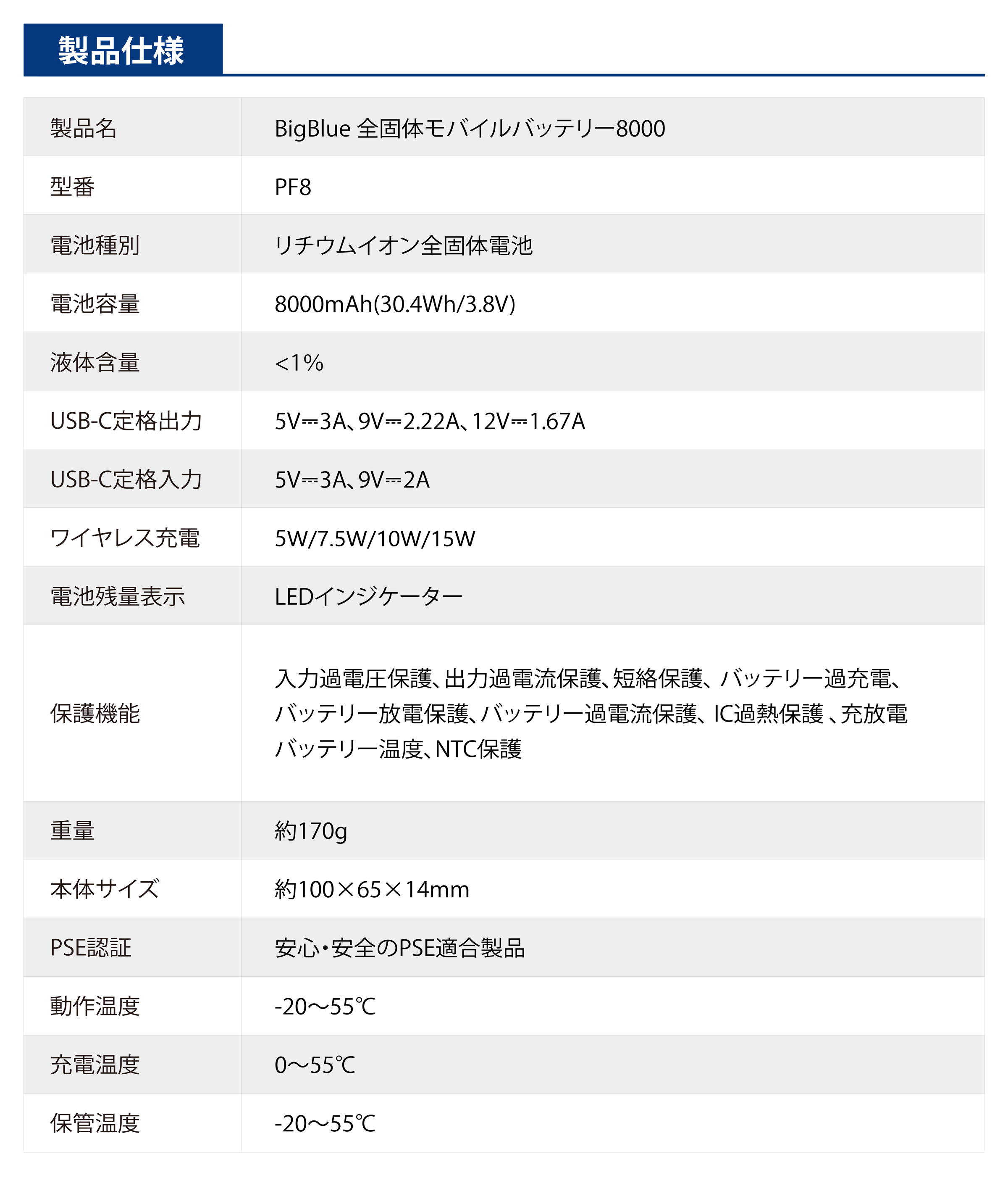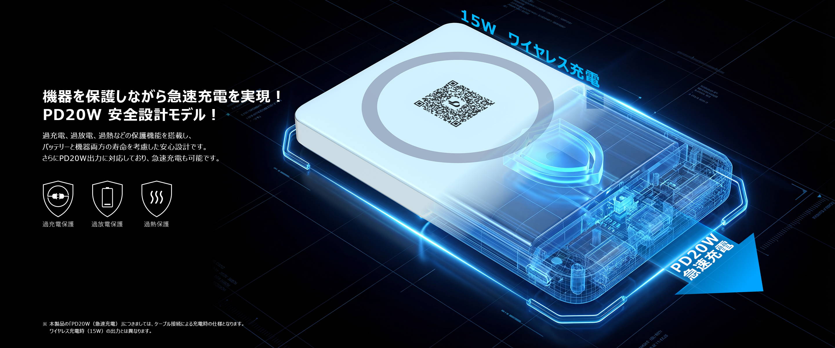過充電・過放電・過熱防止などの保護機能を搭載した安心設計。